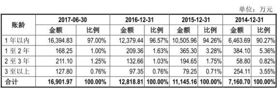 2014年-2017年1-6月,报告期各期末,公司一年以内应收账款占应收账款总额的比例分别为90.27%、94.26%、96.57%及 97.00%,账龄结构良好。2017 年 6 月末的应收账款截至目前回款比例为 57.12%,主要系部分客户的货款仍在信用期内。
