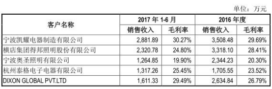 招股书显示,2014年-2017年1-6月,公司向主要客户宁波凯耀电器制造有限公司销售的主要产品为LED灯泡散热器,销售金额分别为689.53万元、3,225.31万元、3,508.48万元、2,881.89万元,向其销售该产品的销售毛利率分别为17.52%、32.19%、29.69%、30.27%。