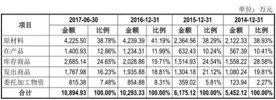公司存货由原材料、库存商品、发出商品、在产品和委托加工物资构成。招股书显示,2013年-2017年1-6月,公司存货账面价值分别为4,775.04万元、5,452.12万元、6,175.12万元、10,293.33万元、10,894.93万元,占流动资产的比例分别为31.12%、31.22%、22.19%、34.45%、31.99%。存货周转率(次)4.59、4.47、5.62、4.99、5.21。