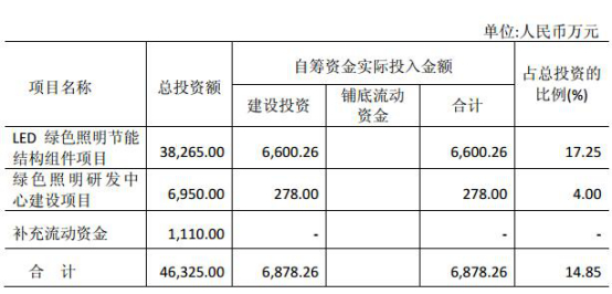 公司本次募集资金净额46,325.00万元用于LED 绿色照明节能结构组件项目、绿色照明研发中心建设项目、补充流动资金。其中,1,110.00万元补充流动资金。