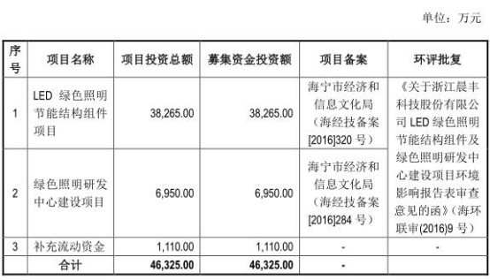 公告显示,公司 2016 年第一次临时股东大会审议通过的《关于募集资金用途的议案》,2017 年第一次临时股东大会审议通过的《关于公司首次公开发行股票募集资金用途的议案》,第一届董事会第九次会议审议通过的《关于公司首次公开发行股票募集资金用途的议案》,本次公开发行股票募集资金在扣除发行费后,将主要用于投资 LED 绿色照明节能结构组件项目、绿色照明研发中心建设项目、补充流动资金项目。根据公司上述会议决议,本次发行前公司以自筹资金对上述项目进行的前期投入包含在本次募集资金投资项目的投资额之内,本次募集资金到位后将以相应额度的资金置换该等项目的前期投入。
