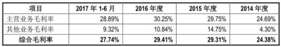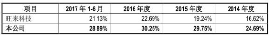 招股书显示,2013年-2017年1-6月,公司综合毛利率分别为25.62%、24.38%、29.31%、29.41%、27.74%。2014年-2017年1-6月,可比上市公司旺来科技毛利率分别为16.62%、19.24%、22.69%、21.13%。