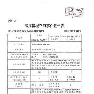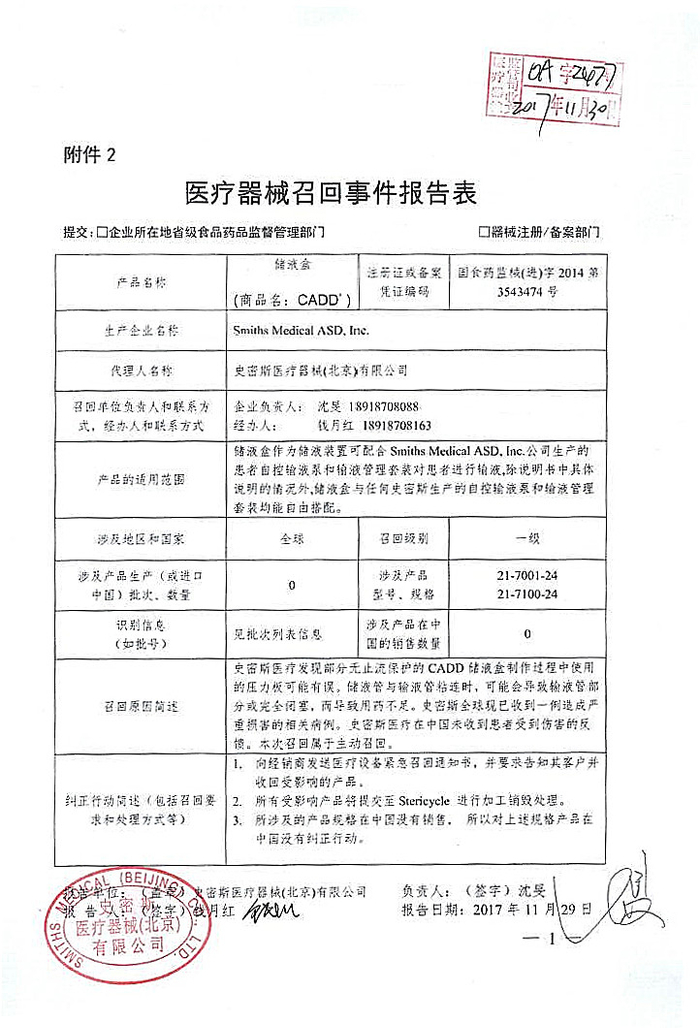 Smiths Medical ASD,Inc.对储液盒(商品名:CADD)主动召回