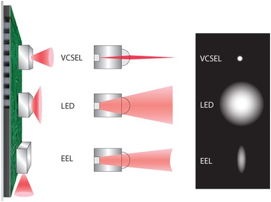 媒体的相关报道和苹果的声明透露了一些技术细节,关于垂直腔面发射激光器(VCSEL)的。该技术是一种新型的半导体激光器,比以前的边缘发射激光器(EEL)有很多优势,下图可以看出来VCSEL光斑更聚焦、亮度更高。