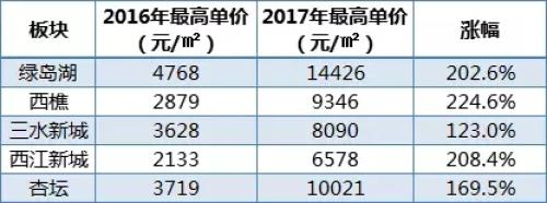 参考近年来土地市场不难发现,佛山多个板块区域地价涨势明显。其中,绿岛湖16年最高楼面价4768元/㎡,17年冲破1.4万/㎡;杏坛16年最高楼面价不到4字头,17年高达1万/㎡。