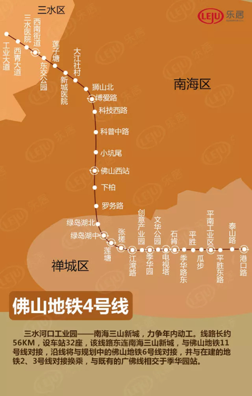 佛山地铁4号线一期禅城段沿季华路东西向敷设,经过绿岛湖片区接入南海罗村,长度为15.8公里,共设9个站点,分别为季华六路站、文华公园站、季华园站、创意产业园站、江湾路站、张槎站、莲塘站、绿岛湖中站、绿岛湖北站。预计2018年上半年开工建设,力争在5年内建成运营。