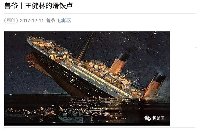 12月11日,兽爷在自媒体公众平台“包邮区”上发表了上述文章,对万达集团现状进行分析,并旋即刷爆了朋友圈。12月14日,万达集团正式发表官方声明,称该文对万达集团和王健林本人进行恶意诽谤和中伤,多处严重违背事实。万达集团已决定向公司属地公安部门报案追究作者刑事责任。