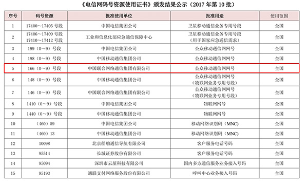 今年8月8日,工信部发布2017年第10批《电信网码号资源使用证书》颁发结果公示,涵盖了130个新号段。其中工信部新批了电信199(0-9)号段、移动198(0-9)号段、联通166(0-9)号段,这意味着三大运营商都将有一批全新的手机号码投放至市场。