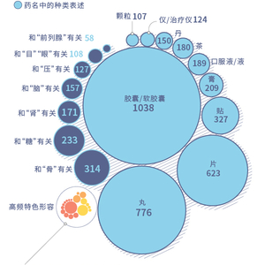 澎湃新闻整合国家食药监总局和丁香医生虚假广告名录数据,经去重处理,2012年至2017年共计5437个药品涉嫌虚假宣传。在这些医疗药品及仪器名称中,最常见的种类表述是胶囊、丸、片等固体药剂。而与“骨”(如骨痛贴,活骨散)、“糖”(如降糖胶囊)和“压”(如降压贴)有关的最多,从药名来看是针对着中老年人的常见健康问题,如骨质疏松、高血压、高血糖等。