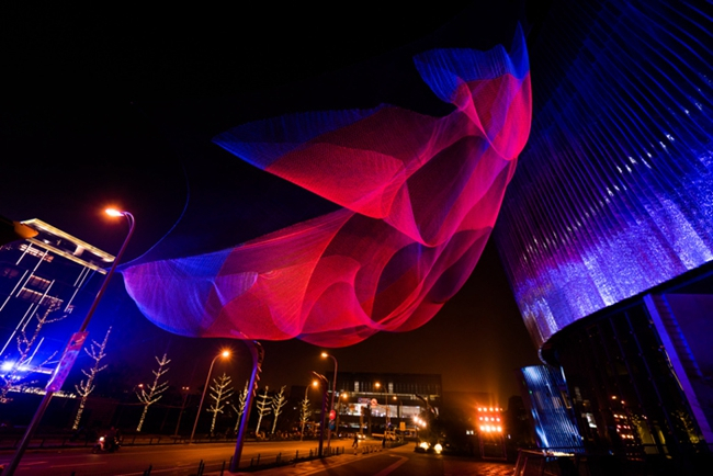 白天,它们多半和高层楼宇施工用的建筑围网并无二致,靠几根纤细的“手臂”,攀附着悬空于相近的建筑物之间,随风舞动。只有当夜幕降临,在灯光的探照下,巨网从平面变身立体,精巧的结构长出雕塑般的线条和肌理。