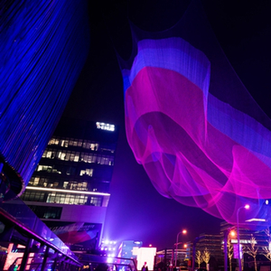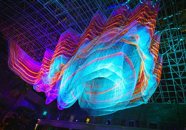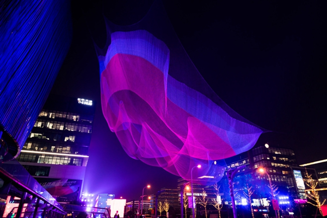 圣诞期间,艾克曼的大型装置《1.26》现身虹桥天地灯光艺术作品展。如果你有事先看过它的宣传图,恐怕会有一种从失望到惊艳的落差:照片留住了人眼所难以捕捉的光影瞬间,霓虹色的变幻却在高度一体的现实造型中惊人得飘逸——这种独特的光谱纤维比钢强15倍。