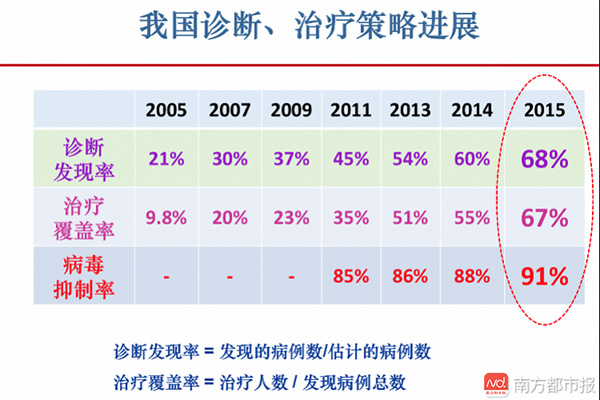 据中国疾控中心流行病学首席专家吴尊友掌握的数据:2015年,中国接受抗病毒治疗的感染者病毒抑制率已经实现了90%的目标,达到91%;治疗覆盖率为67%。