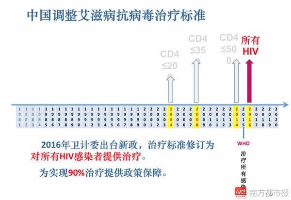 中国国家卫计委也在2016年修订了艾滋病免费抗病毒治疗的标准,对所有HIV感染者和艾滋病患者均建议实施抗病毒治疗,即不再考虑CD4+T淋巴细胞计数水平,只要发现感染就可以开始治疗。