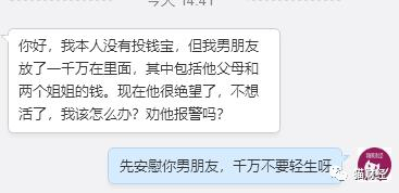 微博网友通过微博私信告诉猫妹,其男友将他自己包括家人的钱一千万一同放入钱宝网,现在有了轻生的念头。