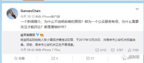 12月27日,据平安南京官方微博透露,钱宝网实际控制人张小雷因涉嫌违法犯罪,于2017年12月26日,向南京市公安机关投案自首。目前,南京市公安机关正在开展调查。