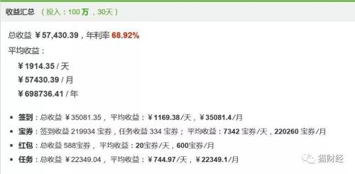 根据计算钱宝网收益的——钱宝任务管家提供的数据显示,在钱包投入100万,放入30天,并积极完成相关任务的话,总收益可达5万7千余元,年利率高达68.92%。而如果放入一年的话,届时收益将近70万元。