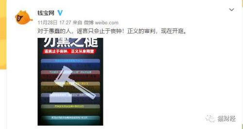 今年11月28日,钱宝网又发微博表示:“对于愚蠢的人,谣言只会止于丧钟!正义的审判,现在开庭。”张小雷回复:“贫穷的解放者,苦难的终结者,正义的守望者,信仰的殉道者。今天,还要再加上一条,谣言的送葬者!黑心的自媒们,坐上被告席的时候,祈祷自己别尿裤子吧。 ”