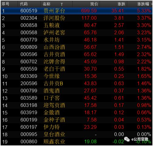 A股19只白酒股中,除了皇台酒业停牌,顺鑫农业跌0.10%,其余全部收红。茅台涨幅最高,另外,洋河股份、泸州老窖、五粮液、水井坊等也均涨超3%。