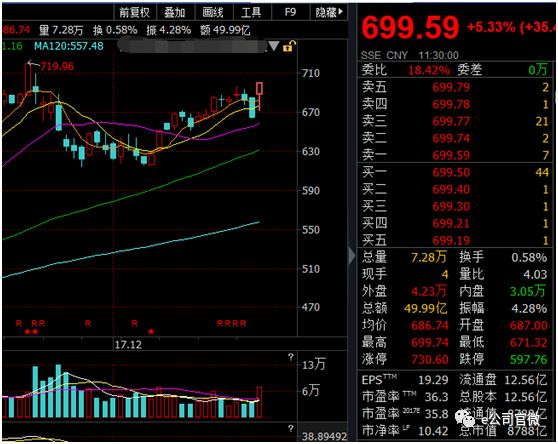 伴随着贵州茅台的提价,贵州茅台股价今天早盘也高开高走,开盘涨超3%,直接以687元价位开盘,稍微下探之后继续走高,接近午盘收盘时最高涨至699.74元,离700元大关仅一步之遥。截至午盘收盘,贵州茅台涨5.33%,报收699.59元。