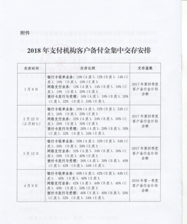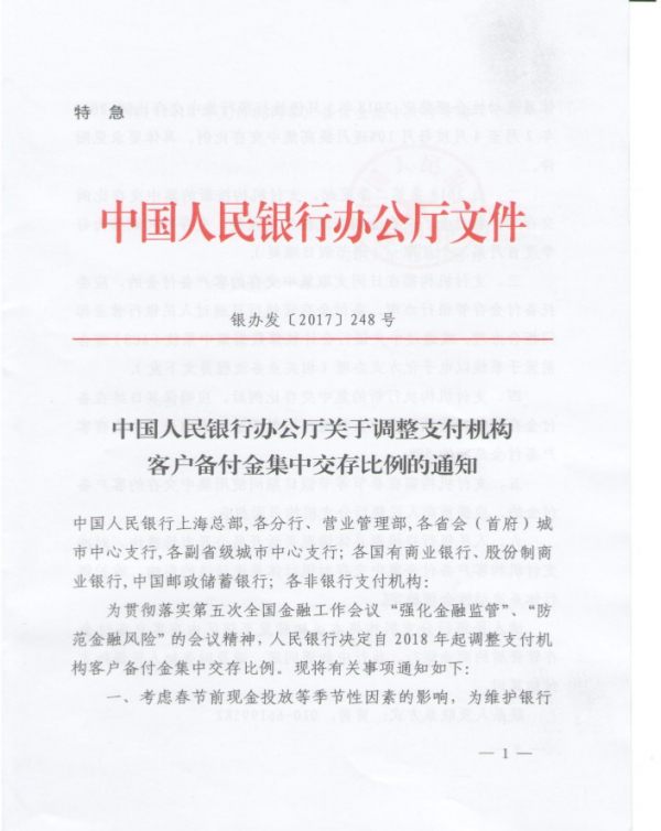 这份加印了“特急”字样文件,全名为《中国人民银行办公厅关于调整支付机构客户备付金集中交存比例的通知》(银发办【2017】248号)。文件中以1月8日、2月22日、3月12日、4月9日为四个时间节点规定了银行卡收单业务、网络支付业务、预付卡发行与受理业务的交存比例。