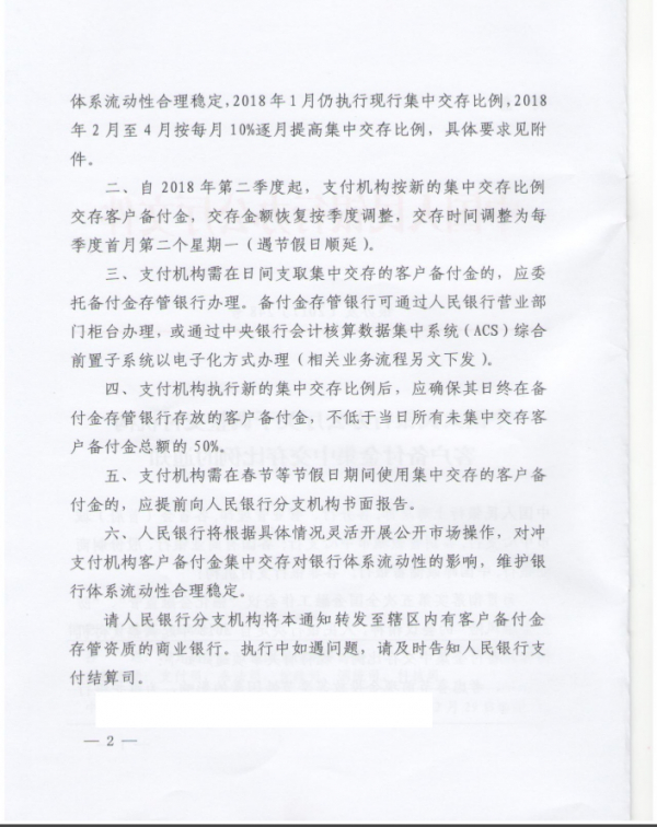 今年 1月,央行发布《关于实施支付机构客户备付金集中存管有关事项的通知》称,自4月17日起,支付机构应将客户备付金按照一定比例交存至指定机构专用存款账户。首次交存的平均比例为20%左右,央行目标为最终实现全部客户备付金集中存管。按照这份文件规定,备付金集中存管以后,将不再产生利息。