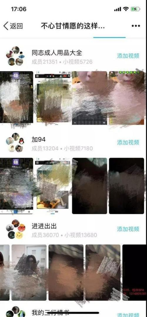 这些略过不表,问题主要出在圈子里。当我循着举报人给我分享的视频,点开该用户的头像,然后在他的圈里就可以看到从几千到几万人不等的几个群,比如“同志成人用品大全”,显示成员有21351人,该群里有5726个小视频;“加94”有成员13204人,有7180个小视频;“进进出出”有成员36070人,小视频高达13680个,这些视频清一色的都是黄色小视频,有袒露胸部和生殖器的,有自己动手丰衣足食的,有借助第三方情趣工具的,有嘴里喊着老婆的,当然,最多的是男性与男性之间互爱的……