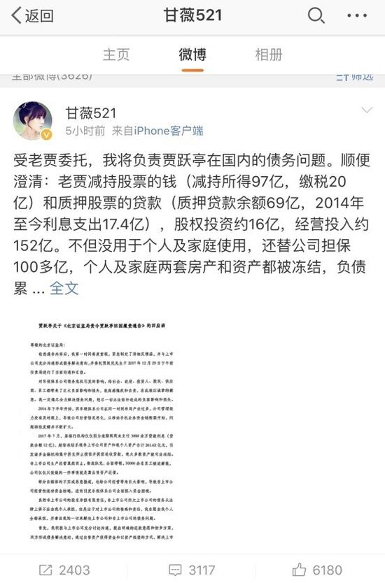 甘薇今日也在微博上宣布,“受老贾委托,我将负责贾跃亭在国内的债务问题。” 此前,在2017年的最后一天,甘薇在微博上打出了北京首都机场的坐标,显示她已经回国。