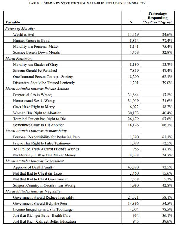 Richard设置了很大的样本数据,对受访者询问了一系列用以衡量道德的数据。包括对道德理念的认知、道德逻辑、个人行为、责任观点、对政府态度与对不平等现象认知等,涉及问题如下: