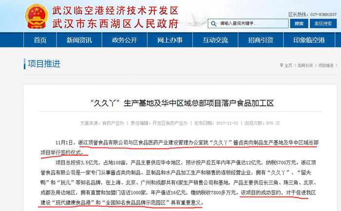 近日,每经小编(微信号:nbdnews)从武汉东西湖区人民政府网站获悉,久久丫所在的浙江顶誉食品有限公司(以下简称“浙江顶誉”)将在武汉建立“酱卤类肉制品”生产基地及华中区域总部,产品主要供应华中地区。