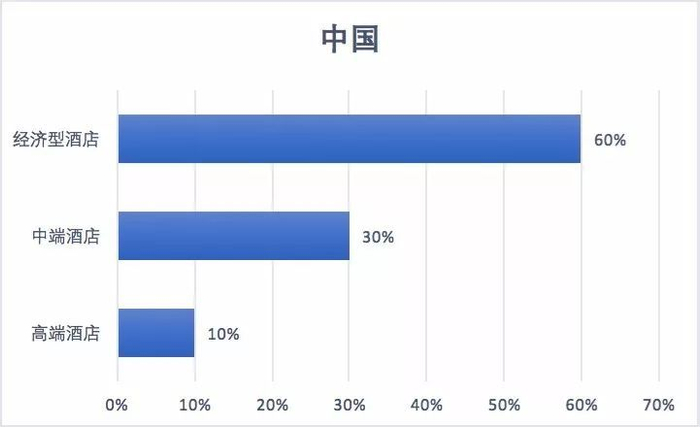 而在中国,目前的高端、中端和经济型酒店的客房数量还是一个金字塔型,比例为1:3:6。