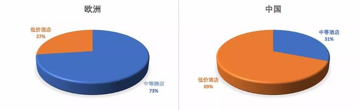 在欧洲酒店市场,中等价格酒店与低价酒店客房数量之比为73:27。
