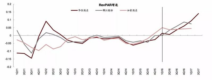 打开公司的RevPAR趋势图便一目了然,这一年是公司RevPAR拐头向上的转折点。(注:RevPAR,Revenue Per Available Room的缩写,即每间可供租出客房产生的平均实际营业收入,计算公式是平均出租率*平均客房价,是酒店业的核心业务指标)