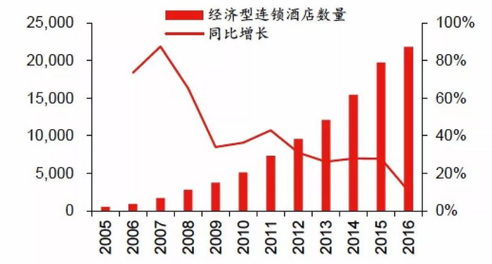 2005年到2016年,中国的经济型连锁酒店从500家扩张到22000家,翻了足足44倍。截止2015年底,全国经济型酒店客房数量突破186万间,在整个酒店市场占比接近60%。