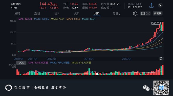 如果去看华住酒店的股价,会发现正是在2012年底改名前后,这家公司开启了五年十倍的上涨之路。