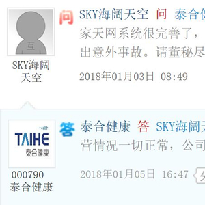 然而在王仁果失联之前,泰合健康也是负面消息不断,不得不在2017年12月26日公告临时停牌。经过一周的停牌核查,1月3日,泰合健康宣布复牌。受王仁果失联事件影响,当天其以每股6.80元价格低开,早盘一度触及跌停,下午14时后股价走势反转,股价也一度回升至7.96元,最终仍报收7.55元。全天振幅超过18%,在全部A股股票中排位居前,并上了龙虎榜。