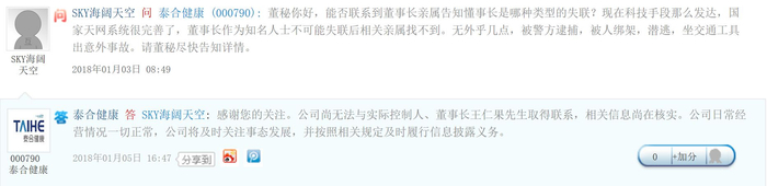 昨日下午16点多时,泰合健康在深交所互动易答投资者提问时披露,公司仍是尚无法与王仁果取得联系。截至2017年12月底,公司的股东户数为31,371户。三天了,三万多股民仍万分想念王仁果,在股吧、互动易平台关切地问王仁果找到没有,甚至有网友表示失联无外乎被警方逮捕、被人绑架、潜逃、坐交通工具出意外事故,要求董秘尽快告知详情。