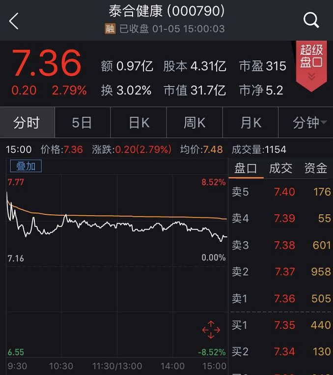 1月4日,泰合健康并未延续涨势,以7.05元价格低开后,报收7.16元,跌幅5.17%。昨日则高开7.55元,一度突破至7.77元,接近涨停,然而高开低走,最终收盘价为7.36元,涨幅仅为2.79%。对于处在实控人失联的风险当口,泰合健康股价表现可谓强势。