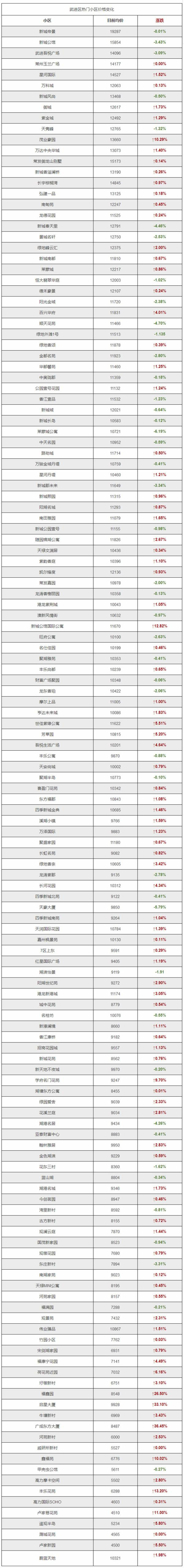 武进区:2017年12月新房成交价在10784元/平米;二手房成交价在11535元/平米。统计142个社区房价,其中105个楼盘房价上涨,最高涨幅36.45%;37小区价格下降,最高跌幅5.79%。