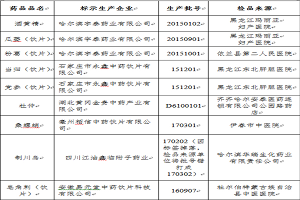 不合格产品标示生产企业包括:哈尔滨宇泰药业有限公司、石家庄市永鑫中药饮片有限公司、湖北黄冈金贵中药产业有限公司、亳州栢信中药饮片有限公司、四川江油鑫临附子药业、安徽易元堂中药饮片科技有限公司。