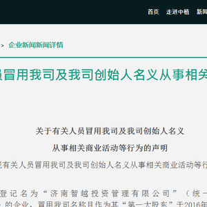 济南智越的股东中,除了法定代表人何倩苹和监事谭顺娜,另一股东为“中植集团”。且中植集团持股51%,为第一大股东。中植集团声明称,济南智越于2016年12月冒用公司名称进行了工商登记注册后,在2017年开展了融资项目担保业务。