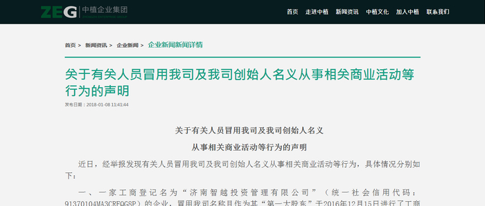 1月8日,中植企业集团有限公司(下称“中植集团”)一则声明引发关注。声明称,有3家公司冒用中植集团及集团创始人解直锟名义,从事相关商业活动;中植集团与这3家公司不存在任何股权关系或商业合作关系。目前已向公安机关报案并被受理,同时向法院提起行政诉讼。