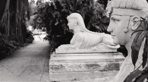 漫步花园里,穿行于参天巨树间,园中道路交叉如迷宫。在修剪齐整的树篱、草坪和喷水池间,满是文艺复兴风格的雕像。台阶和建筑物外墙的珊瑚石,带着岁月的沧桑和自然的年轮,令人倍感时光赋予杰出建筑的光晕。近百年的光阴和海风让那些原本光洁的雕塑和墙壁变得斑驳,荒废倾颓,但依稀可辨曾经的恢弘和精致,一幕旧日美国梦让人心旷神怡。