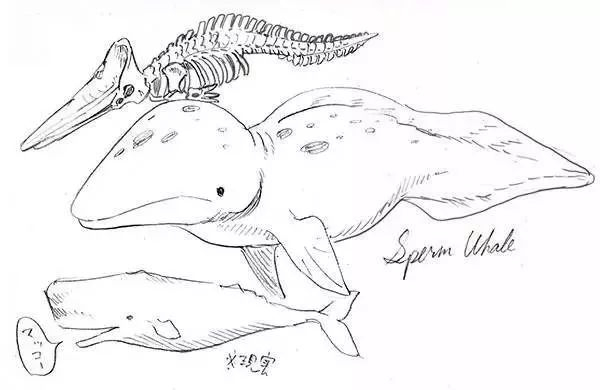 村田雄介漫画中,抹香鲸的骨架、“未来人类的想象复原图”和真实的抹香鲸。图片来源:宁静海的菊石君