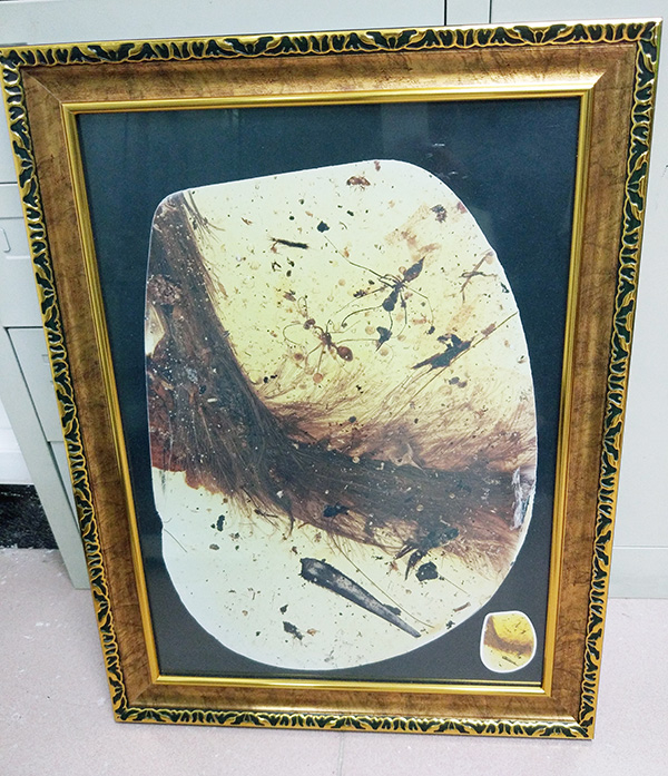 邢立达办公室地上放着琥珀中的恐龙化石图片。澎湃新闻记者 章文立 图