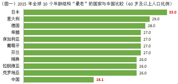 2015年全球10个年龄结构“最老”的国家与中国比较(60岁及以上人口比例)