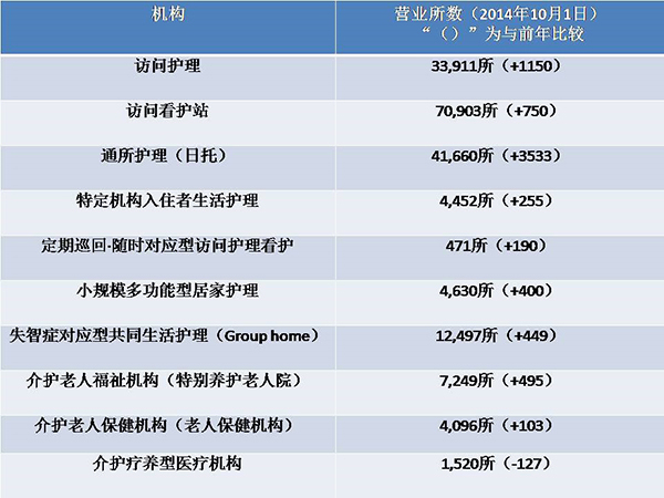 日本养老服务机构的类型和支持的种类非常多,包括居家看护、日托、失智老人护理、老年公寓等等。由于介护保险的推行,这几年日本居家护理和日托发展非常快,而且日本对小规模多功能养老设施的支持力度也很大。下图是2014年日本养老服务机构的类型和数量。