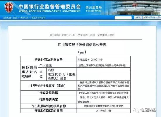 浦发银行晚间公告,银监会四川监管局18日对公司成都分行作出行政处罚决定,对成都分行内控管理严重失效,授信管理违规,违规办理信贷业务等严重违反审慎经营规则的违规行为依法查处,执行罚款4.62亿元。对此,公司坚决支持和接受监管机构的上述处罚决定,并深表歉意。上述处罚金额已全额计入2017年度公司损益,对公司的业务开展及持续经营无重大不利影响。