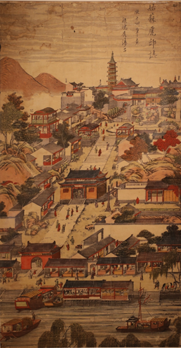 这批“姑苏版”的印刷品最近有部分回到苏州,参加工艺美院的年画展。隔着玻璃和略粗糙的画质,《姑苏虎丘志》泛黄的卷轴上,人物跳跃,笔触柔和,一张版画刻尽了千年姑苏城的山峦秀美。
