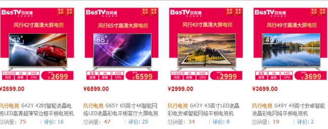 国美的电商平台上,风行电视属于“自营”,型号上比天猫旗舰店所售再多了一款55英寸的,所有的评论人数累计没有超过300人。