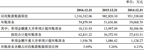 2014年至2016年逾期应收账款计提坏账准备分别为43,891.03万元、37,919.77万元、51,799.51万元;逾期应收账款计提坏账准备占逾期应收账款余额比例分别为32.86%、22.31%、26.04%。